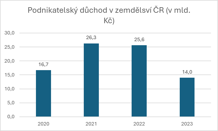 Podnikatelský důchod v zemědělství byl za poslední roky nejvyšší v letech 2021 a 2022, kdy dosáhl 26,3, respektive 25,6 miliardy korun. V roce 2023 podle předběžných údajů ČSÚ klesl na přibližně 14 miliard korun, což je meziročně asi o 45 procent méně. I zde se do jisté míry promítá nárůst nákladů zemědělců, ale také jakýsi návrat směrem k dlouhodobému normálu. Podnikatelský důchod v zemědělství totiž v roce 2020 činil asi 16,7 miliardy korun.