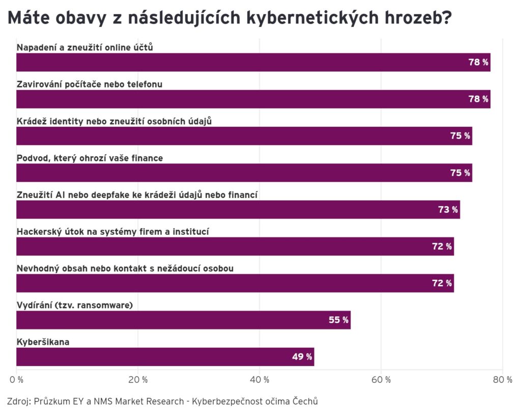 Češi se kybernetických útoků sice bojí, ale pro efektivní ochranu často nedělají ani minimum. Jak vyplynulo z průzkumu, který vznikl ve spolupráci EY a společnosti NMS Market Research, uvědomují si, že je kyberbezpečnost důležitá, přesto ji často zanedbávají. Šetření odhalilo, že její zabezpečení převážně očekávají od institucí a firem.