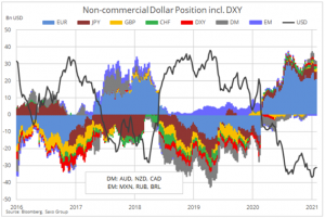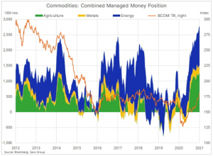 Býčí sázky na 24 hlavních komoditních futures si dál drží svou rekordní úroveň. Už od počátku listopadu, kdy se objevily první zprávy o funkčních vakcínách a Biden vyhrál volby, ceny na trhu čím dál víc zohledňují očekávaný růst a stoupající inflaci. Navíc se objevují známky toho, že poptávka po obilí, ropě i průmyslových kovech začíná předhánět nabídku, což s sebou přináší rostoucí očekávání ohledně nového komoditního supercyklu. A tak se od počátku listopadu 2020 zvýšily spekulativní dlouhé pozice o třetinu a v posledním týdnu dosáhly 2,8 milionu lotů, což představuje nominální hodnotu 144 miliard dolarů.