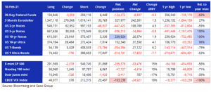 Pokud pomineme futures na pětileté a ultra dluhopisy, byly kapitálové fondy čistými kupujícími futures s pevným výnosem po celé křivce. Různé akciové trhy, včetně S&P 500, dosahovaly rekordních úrovní, a tak spekulanti prodávali futures na index Cboe VIX. Čisté krátké pozice stouply o 24 921 lotů, a vzhledem k tomu, že bylo v předcházejícím týdnu prodáno 21 807 lotů, dosáhly celkové čisté krátké pozice jednoletého maxima 163 000 lotů. To vše předtím, než zvýšená nervozita z rostoucích výnosů obligací přispěje k poklesu akcií a mírnému růstu volatility.