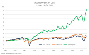 Nejvýznamnějším trendem od velké finanční krize je divergence růstu výnosů indexu Nasdaq 100 a světového akciového trhu, která ještě zvýrazňuje, jak groteskní je relativní úspěch online ekonomiky ve srovnání s ekonomikou fyzickou. Výnosy firem z indexu Nasdaq 100 se od 4. čtvrtletí roku 2003 zvýšily o 828 % na akcii, zatímco výnosy indexu MSCI World jen o 114 %. Tento trend vysílá investorům výrazný signál, že budoucnost patří digitalizaci ve všech jejích formách, a v důsledku toho plyne kapitál primárně do internetového obchodování, softwaru, plateb, herního průmyslu apod.