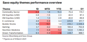 V nejspekulativnějších růstových segmentech, ať už jde o „bublinové“ akcie (akcie s vysokým poměrem EV a tržeb a se zápornými očekávanými výnosy), internetové obchodování, herní průmysl, zelenou transformaci či zdravotnické firmy nové generace, vyvolají rostoucí úrokové sazby pravděpodobně pokles hodnoty akcií, tak jako koncem února a začátkem března. A pokud úrokové sazby dál porostou, mohou přetrvat i tyto tlaky.