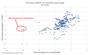 Deficit americké ekonomiky činí v současnosti 16,2 % HDP. V tom ovšem ještě nejsou zohledněny nové stimuly ve výši 1,9 bilionu dolarů. S rostoucí proočkovaností populace se znovu roztočí kola ekonomiky a skutečný produkt rychle dožene ten potenciální. Až k tomu dojde, bude americká ekonomika v situaci s extrémně vysokými stimuly a nulovou produkční mezerou. To může vyvolat dlouhodobější reálnou inflaci a ukotvit inflační očekávání na vyšší úrovni.