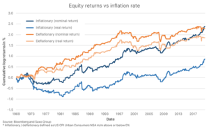 V nedávné studii jsme se zabývali výnosy amerických akcií od roku 1969 v různých inflačních režimech a zjistili, že inflace přesahující 3,1 % neprospívá reálným akciovým výnosům (i když nominálně dál vypadají dobře) a že měsíce, kdy inflace roste, s sebou nesou nižší relativní reálné akciové výnosy ve srovnání s měsíci, kdy inflace klesá. Je třeba si uvědomit, že inflace zvyšuje cenu kapitálu a vytváří volatilitu, která firmám komplikuje rozhodování.