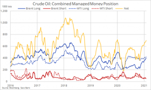 Ke zlepšování ekonomických fundamentů a rostoucí poptávce po zajištění proti reflaci se přidalo ničím netlumené momentum a hedgové fondy zvýšily své kombinované čisté dlouhé pozice v ropě WTI a Brent na 699 tisíc lotů. Chybí už jen pár tisíc, aby dosáhly hodnot předchozích dvou vrcholů z let 2019 a 2020. Vzhledem k současným indexům RSI na úrovni překoupenosti to sice může znamenat riziko krátkodobého zvrácení trendu, ale nezapomínejme, že v roce 2018 dosáhly čisté dlouhé pozice téměř 1,1 milionu lotů.