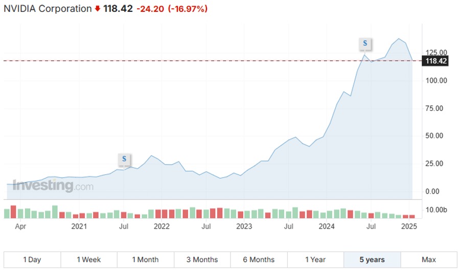 Vývoj ceny akcií společnosti Nvidia za posledních 5 let. (Zdroj: Investing.com)*
