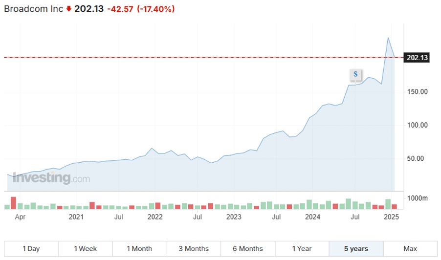 Výkonnost ceny akcií společnosti Broadcom za posledních 5 let. (Zdroj: Investing.com)*