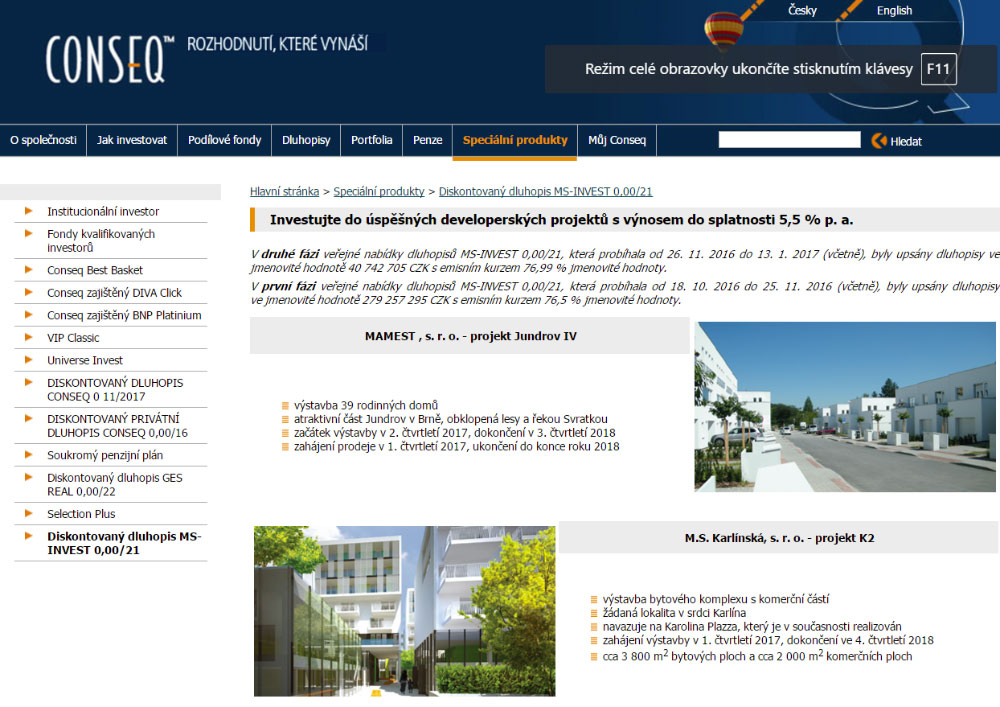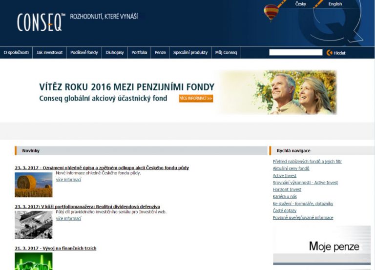 Tento díl je věnovaný společnosti Conseq, která ve svém akciovém účastnickém fondu v roce 2016 dosáhla zhodnocení 10,81 %. Naše recenze, která má zá úkol zhodnotit brokerský web z pohledu nováčka, bude zaměřena na úroveň přehlednosti, zpravodajství a kvalitu nabízených služeb.