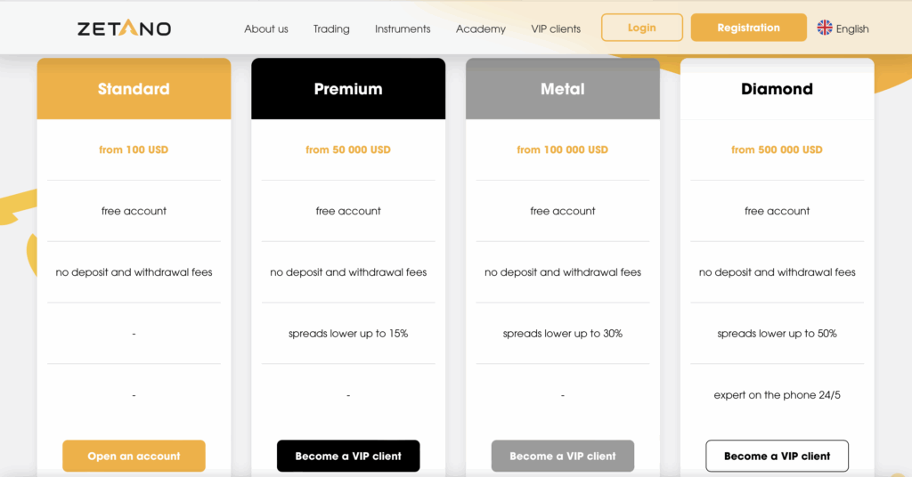 Broker má 4 obchodní účty a 3 z nich umožňují stát se VIP klientem, rozdíl je pouze ve částce.