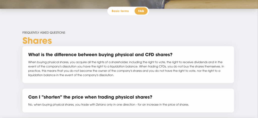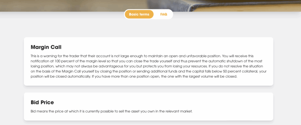 V sekci FAQ jsou přehledně popsané veškeré informace potřebné k obchodování. Pokud jste v obchodování začátečníci, určitě oceníte slovník pojmů, který je součástí této sekce. Najdete zde všechny potřebné informace pro vaše obchodování. Celý slovník je přehledný a usnadní vám orientaci v odborných termínech a konceptech, což je velmi užitečné pro pochopení obchodních procesů a strategií.
